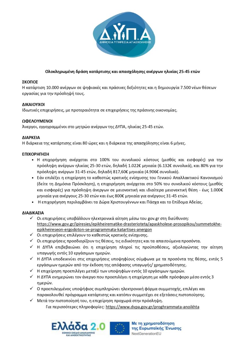 Ολοκληρωμένη δράση κατάρτισης & απασχόλησης ανέργων ηλικίας 25-45 ετών